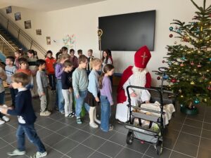 Am 5.12. besuchte uns der Nikolaus in der Schule. Alle Kinder standen ganz erwartungsvoll in der Aula, als wir schon von Weitem den roten Mantel entdeckten. Wir begrüßten den Nikolaus mit dem Lied „Applaus für den Nikolaus“ und hatten auch ein Gedicht für ihn vorbereitet. Er begrüßte uns auch freundlich und las aus seinem goldenen Buch vor. Er hatte uns auch in einem Bollerwagen Hefenikoläuse und Mandarinen mitgebracht, über die sich alle freuten. Wir verabschiedeten ihn mit „Lasst uns froh und munter sein“ und hoffen, dass er uns im nächsten Jahr wieder besucht.