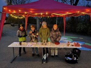 Nach den Aufführungen der Schulkinder gab es die Möglichkeit auf dem Schulhof verschiedene gebastelte weihnachtliche Dinge der Kinder, entstanden bei den diesjährigen Basteltagen, zu erwerben. Der Elternbeirat und der Förderverein hatten einen Weihnachtsmarkt auf dem Schulhof aufgebaut, bei dem es außer Ständen mit hergestellten Dingen der Kinder auch kulinarische Angebote gab. Liebevoll dekoriert mit Lichterketten, Weihnachtsmusik aus der Musikanlage, Stehtischen zum Verweilen und einer Feuerschale, an der man sich aufwärmen konnte, genossen alle die weihnachtliche Atmosphäre auf dem Schulhof. Ein schöner Ausklang vor den Weihnachtsferien!